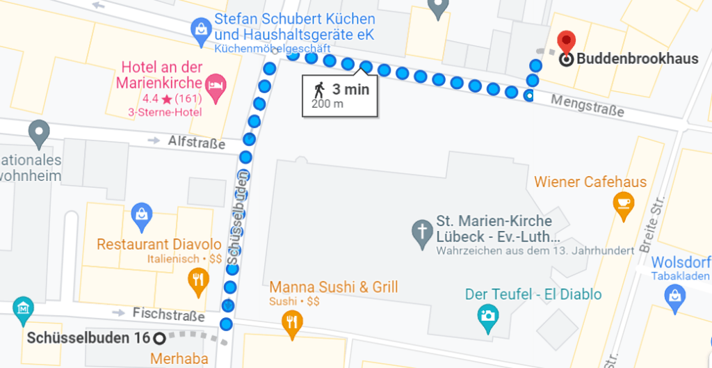 1885 kam Julius Mannhardt nach Lübeck. Seine erste Anschrift war Schüsselbuden 16. Die Familie Mann wohnte schräg gegenüber.